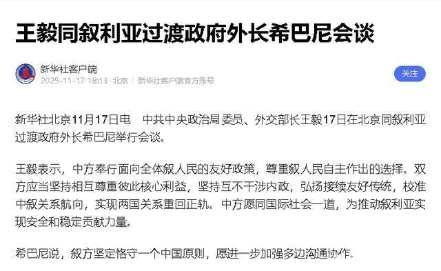 也让国际社会看到了中国在处理国际事务时的理性和原则性,我们可以持续关注,看看叙利亚能不能拿出足够的诚意,中国又会在哪些领域为叙利亚提供支持。 毕竟战后重建是个长期的过程,需要各方共同努力,要是中国能参与其中,不仅能帮叙利亚尽快恢复稳定,也能为地区发展注入新的动力。 参考资料: 1、2025-11-17新华社客户端王毅同叙利亚过渡政府外长希巴尼会谈