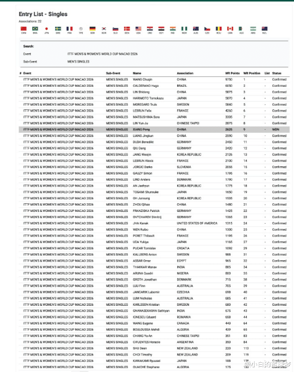 北京时间2月28日,ITTF官方宣布,2026年澳门世界杯中国队的参赛名单出炉: